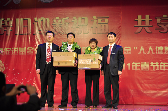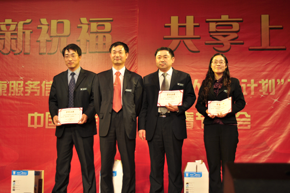 李世東董事長(右一)、韓春善總經理(左一)為行政中心總監尹和清先生、郭小衛主任頒發后勤支持獎
