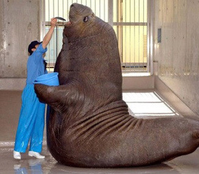 哈哈。飼養員好辛苦哦。還好它可以自己抱著“飯桶”